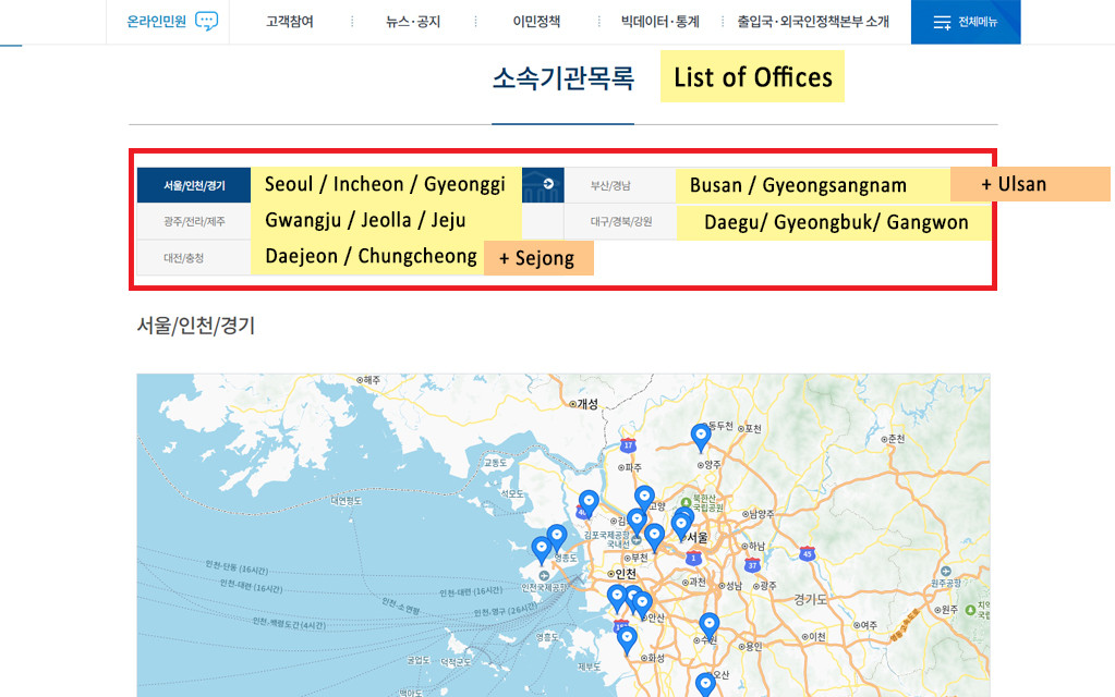2. Under the “소속기관목록” (List of Offices), choose the tab that matches the city or province where you’ll be living. Ulsan is listed under 부산/경남 (Busan/Gyeongsangnam), and Sejong is under 대전/충청 (Daejeon/Chungcheong). 전라 (Jeolla) includes both Jeollabuk and Jeollanam. 충청 (Chungcheong) includes both Chungjeongbuk and Chungjeongnam.