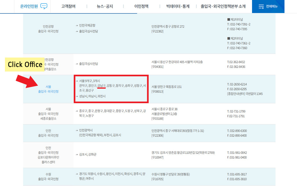 3. Scroll down below the map to see the list of offices. Instead of checking them one by one, use Ctrl+F (or Command+F on Mac) to search for your city (시), county (군), or district (구). For example, if you live in Gangnam, search for “강남구.” Make a note of the Office Name, Address, and Phone Number. Click the office name for more details.
