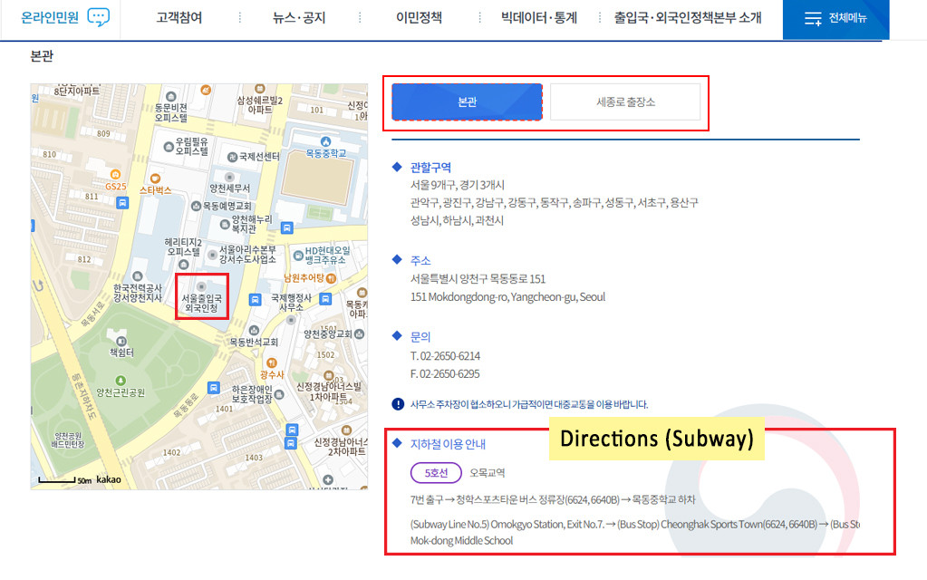 - For example, if you click the Sejongro Branch (세종로출장소) of the Seoul Immigration Office, you’ll still see the main branch (본관) first. Be sure to switch to the correct tab to get the right directions.