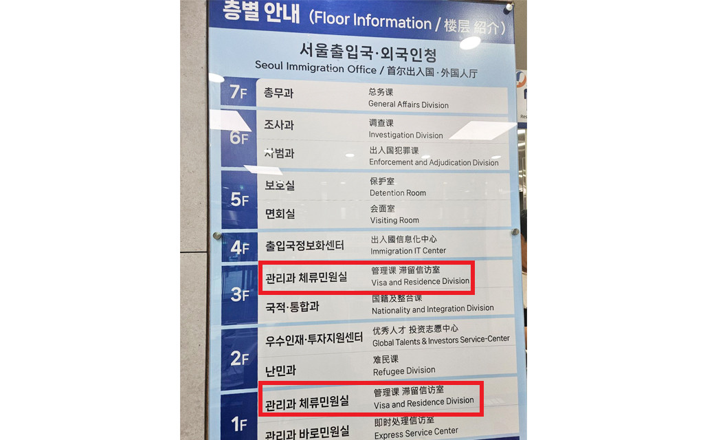 - Locate the “Residence (Permits/Division/etc.) Floor in your local office (체류민원실 in Korean)
