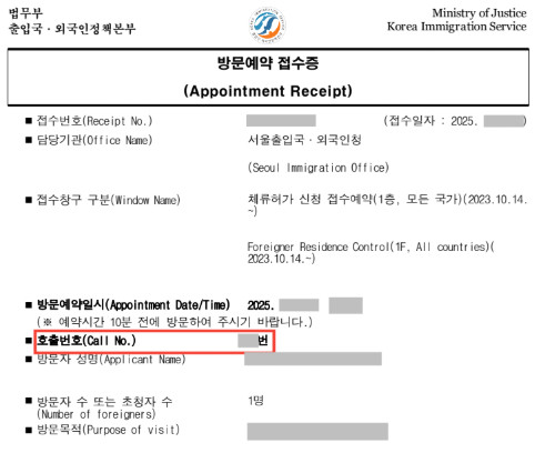 • Print out the appointment receipt from Hi Korea • Remember your Call Number (Call No.), this number will appear on the screen at the office. Go to the booth with that number when called.