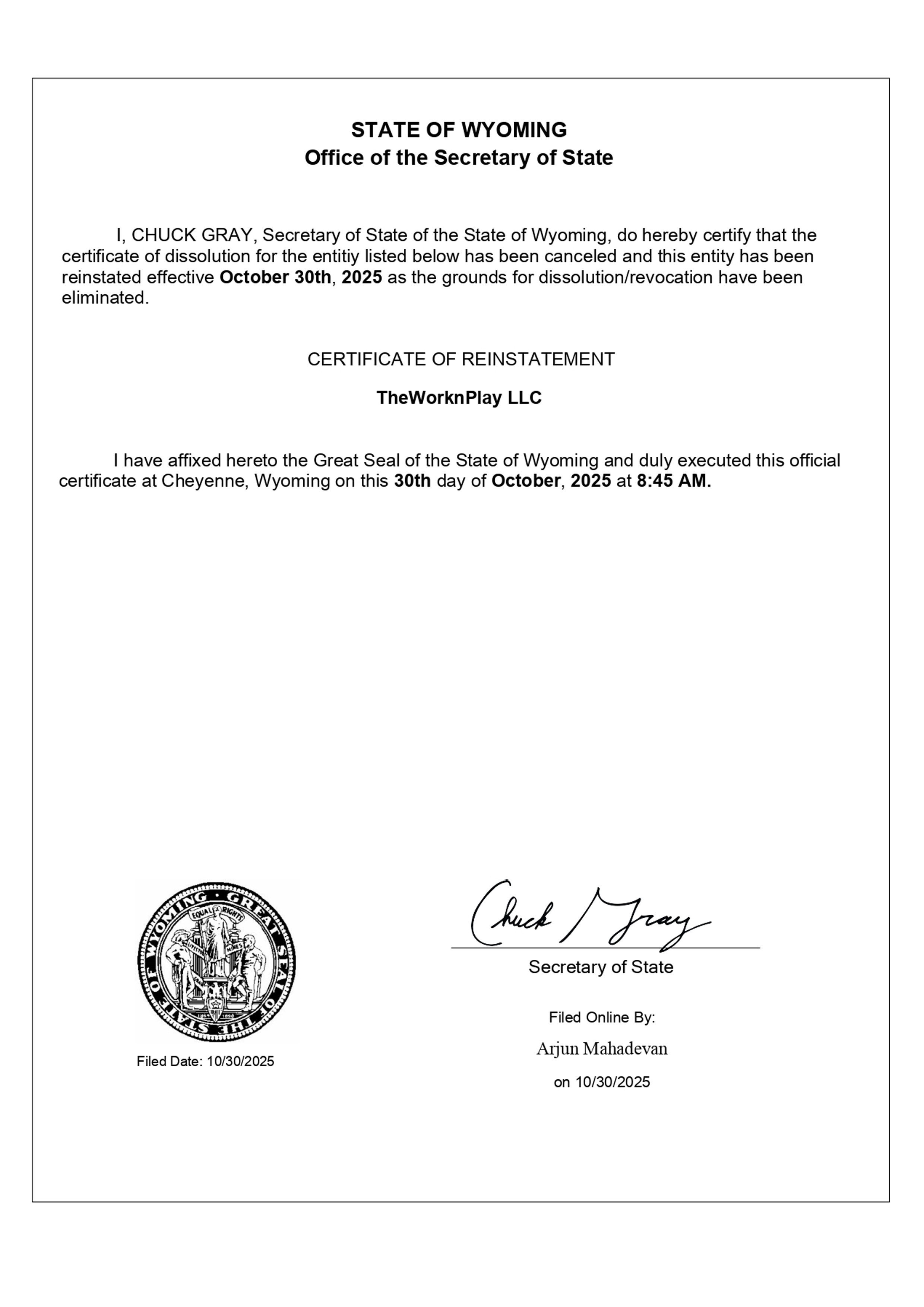 Company Information Company: TheWorknPlay LLC | (주) 워크앤플레이 CEO: Derek O'Grady Business Registration Number (BRN): 227-86-02835