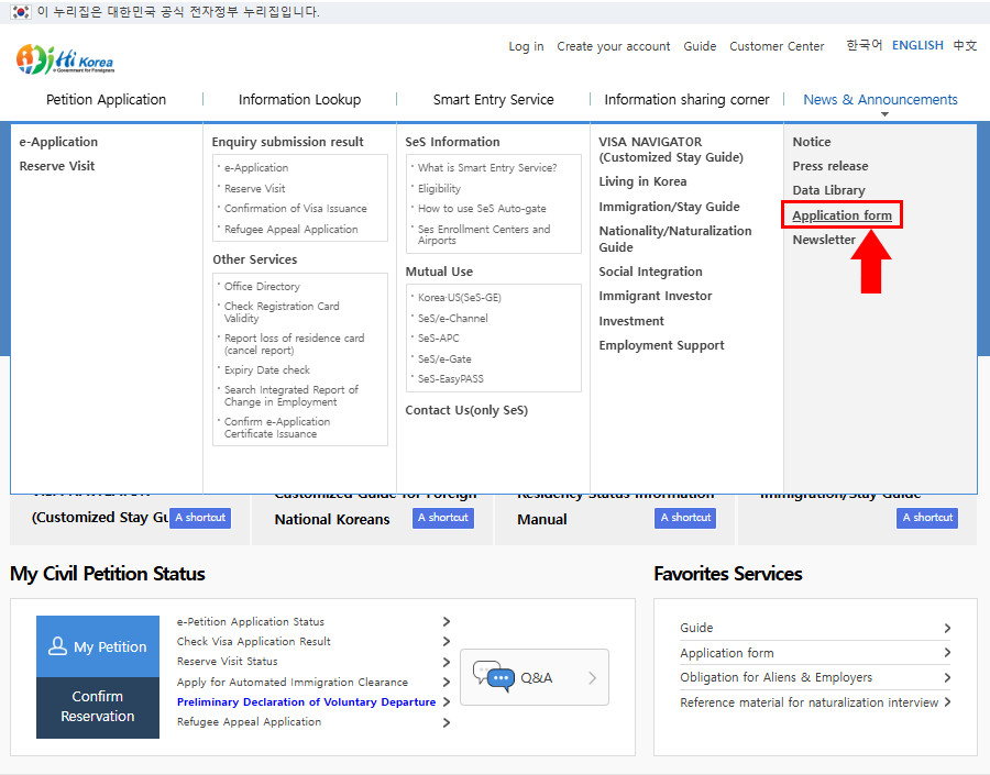 3. Scroll down to the "Visas" section and locate the "application form for a certificate of visa issuance approval". The document is provided in Word, PDF, and HWP.