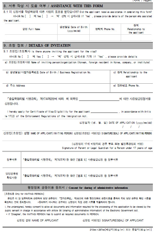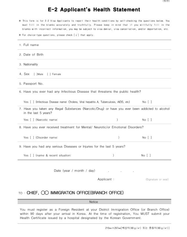 You must complete the form truthfully, as you will undergo a medical examination upon arrival in Korea to confirm you are fit to work. As stated in the form, leaving blanks or providing false information may result in visa denial, cancellation, or deportation.