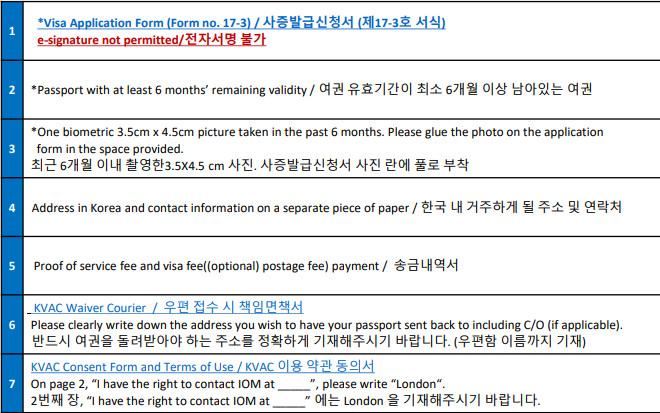 Following a governmental decision by the Republic of Korea to centralize visa processing in Berlin (Germany), the Visa Offices of a few selected ROK Embassies in Europe, including the London Embassy, no longer receive visa applications. You can ONLY submit your documents by mail/post to KVAC.