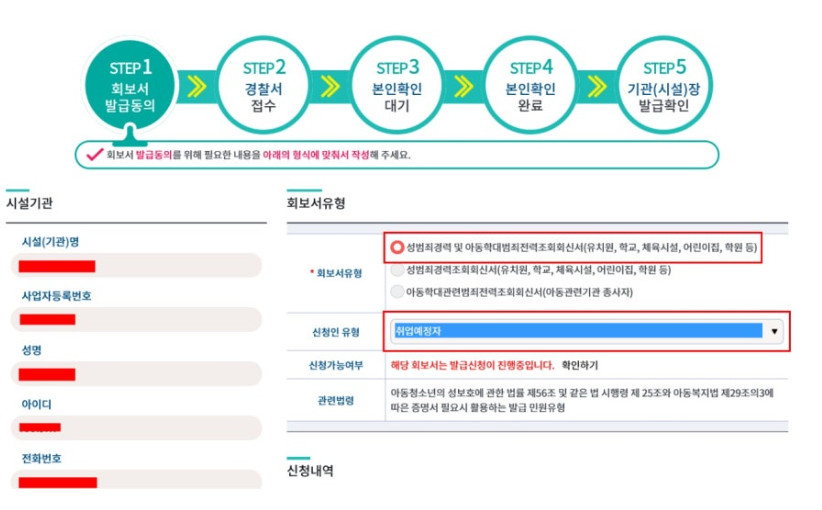 1. Click the first option as shown in the above image (성범죄경력 및 아동학대범직전력조회회신서 (유치원, 학교, 채육시설, 어린이집, 학권 등).