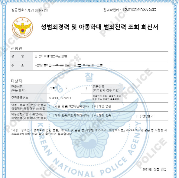 You can obtain a criminal record certificate (for sex offense and child abuse checks) without visiting a police station by using the online Criminal Record Certificate Issuance System.