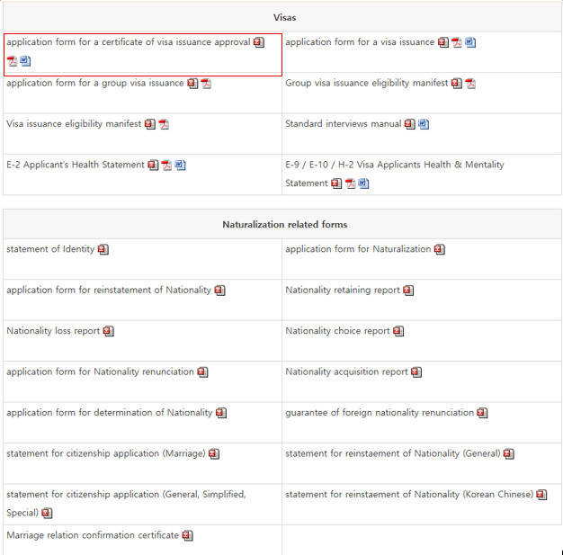 3. Scroll down to the "Visas" section and locate the "application form for a certificate of visa issuance approval". The document is provided in Word, PDF, and HWP.