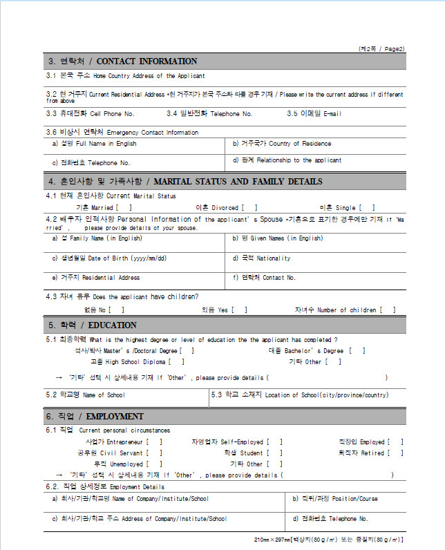 - Emergency Contact Information (a. Full Name in English b. Country of Residence, c. Telephone No. d. Relationship to the applicant)