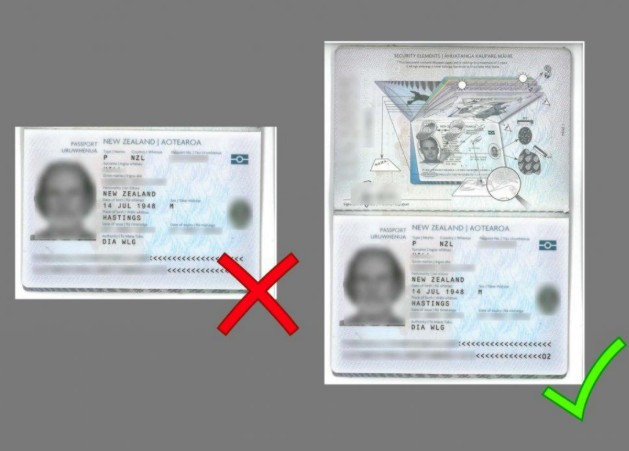 2. Take a photo in "Portrait mode" clearly showing the top page with the holder's signature (must have a written signature) and the bottom information page, including the Machine Readable Zone (MRZ). Make sure to take the photo straight on, so the scan isn't tilted or lopsided