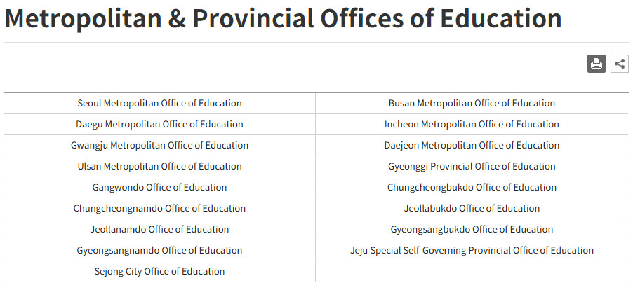 Korea’s education system is organized around 17 Metropolitan and Provincial Offices of Education, each aligned with one of the country’s 17 first-level administrative divisions. These divisions include: