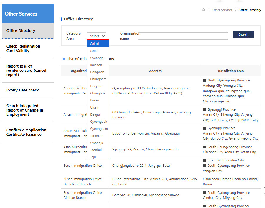 If you do not know the name of your immigration office, select your province, metropolitan city, or region in the "Category Area" (e.g., Seoul). Then check the jurisdiction area to see if your city or district (gu) is covered.