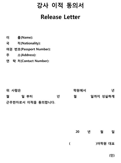 • Notice Requirements: While Korean labor law does not impose a mandatory notice period from workers to their employers, providing the notice specified in your contract protects you from potential disputes or claims for damages.