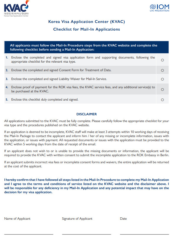 Following a governmental decision by the Republic of Korea to centralize visa processing in Berlin (Germany), the Visa Offices of a few selected ROK Embassies in Europe, including the London Embassy, no longer receive visa applications. You can ONLY submit your documents by mail/post to KVAC.