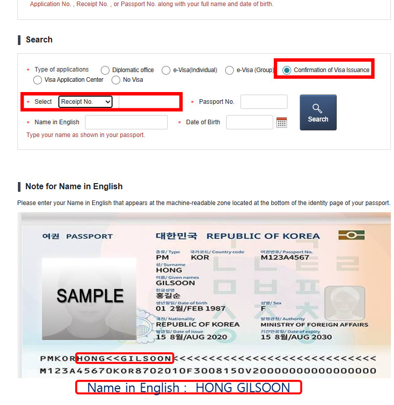 - You will be directed to a form page. For “Type of applications,” choose “Confirmation of Visa Issuance.” For “Select,” choose “Receipt No.” and enter the number we provided. Next, enter your passport number, your name in English (as it appears on your passport), and your date of birth.