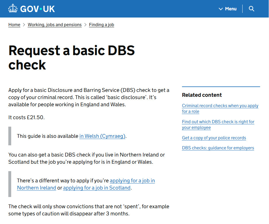 Request a basic DBS check (for "unspent convictions and conditional cautions") from the UK Home Office (GOV.UK).