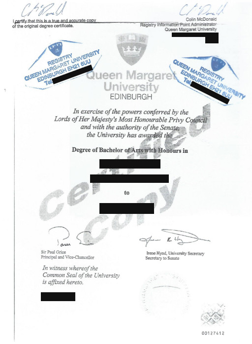 You can ask for a certified copy of your degree from your university, which means the university will notarize a copy of your diploma through a UK practicing solicitor or notary public. Check to see if your copy is signed, dated, and certified by a notary public.