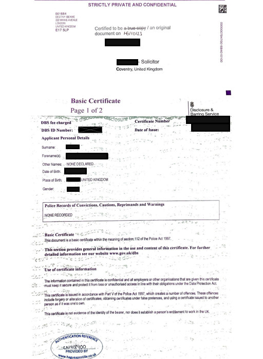 DBS criminal background check by the Disclosure and Barring Service requires a national-level apostille from the Foreign, Commonwealth & Development Office (FCDO). ACRO background checks will NOT be accepted.